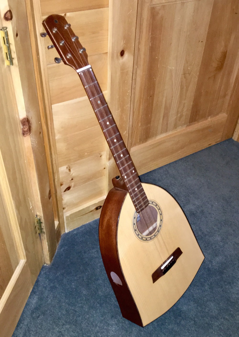 Converted from a guitar w. bell shape body that was languishing—this is much happier as a pseudo-zouk with 3 pairs tuned CGC (octaves on the lower). Fabulous sound and plays like butter; strong sustained & deep response with none of the metallic plinky-ness of some Greek bowl backs. Patterned after a simpler model I made in 1973 as an alternative to dulcimer, with all the frets and easier for a guitarist like myself to hold & move on.