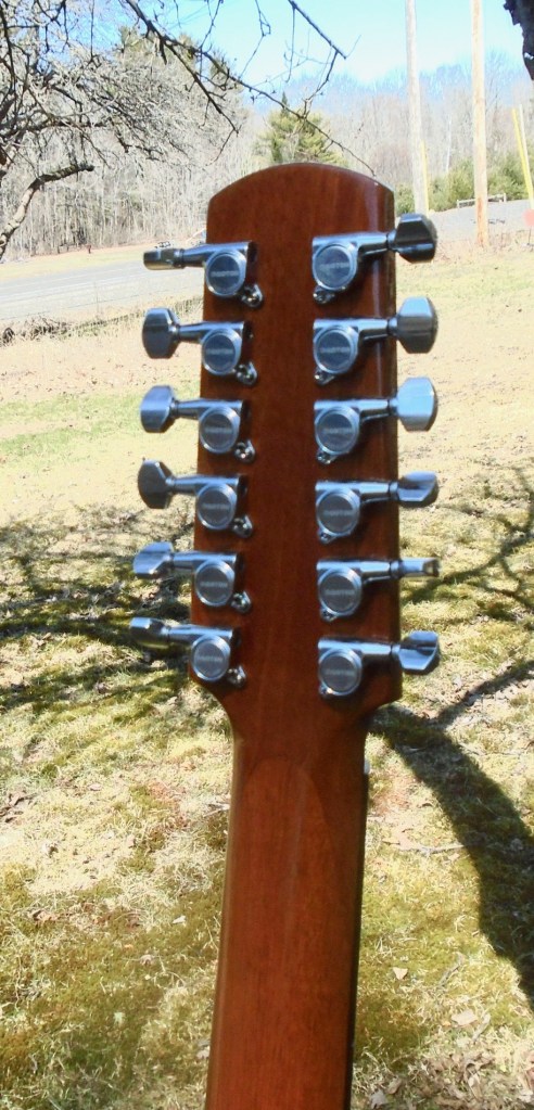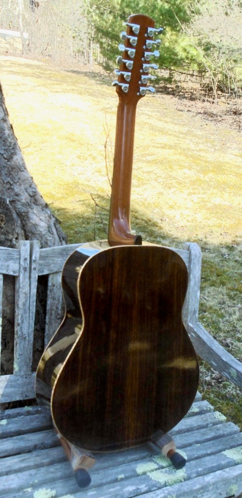 Baritone 12-string with Indian Rosewood and fine spruce top. Indian Rosewood rosette, reclaimed mahogany neck. Sipo head overlay with a border of ebony and perloid. Fretboard and bridge are ebony. The tailpiece absorbs strings tension, relieving stress on the top and allows for lighter, more responsive bracing and greater stability.  Moveable saddle for precise intonation adjustments, adjustable truss rod and unique neck angle adjustment for easy playability. This guitar has an especially deep and rich tone.